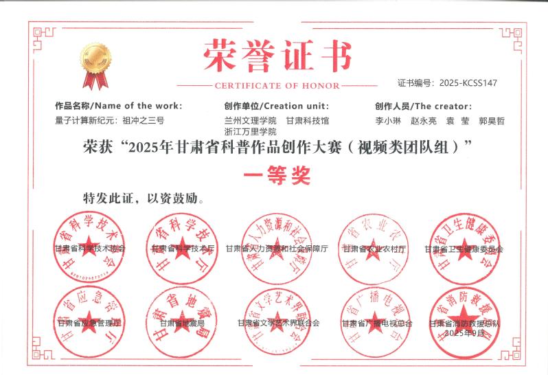 近日,甘肃省科学技术协会公布了2025年甘肃省科普作品创作大赛获奖结果,伟德艺术职业学院教师李小琳老师主导创作的科普视频作品——《量子计算新纪元:祖冲之三号》,荣获大赛“视频类团队组一等奖”。
