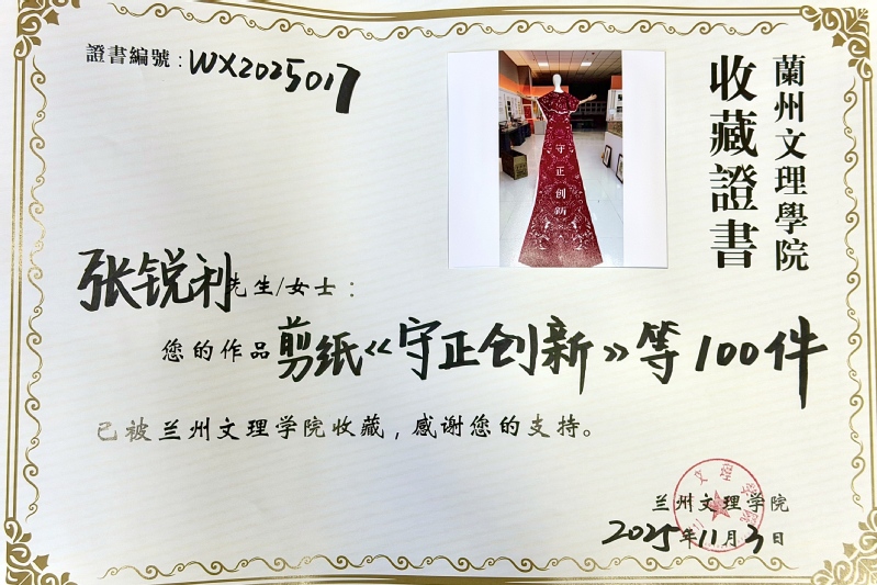 张锐利长期致力于庆阳剪纸的保护与创新,曾受邀为伟德文学院非遗保护专业学生授课,系统传授剪纸技艺与文化内涵。此次捐赠的作品凝聚其二十余年的创作成果,其中“守正创新”主题披肩式剪纸等创新作品,现陈列于伟德非遗知识馆,受到师生广泛关注。