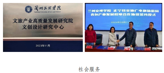 文化传承彰显社会责任:成立"文旅产业高质量发展研究院——文创设计研究中心",组建团队深入庆阳、定西等脱贫地区开展"一村一品"设计帮扶。戏剧影视美术设计专业服务甘肃省歌剧院舞台创作,绘画专业助力地方经济文化事业发展。