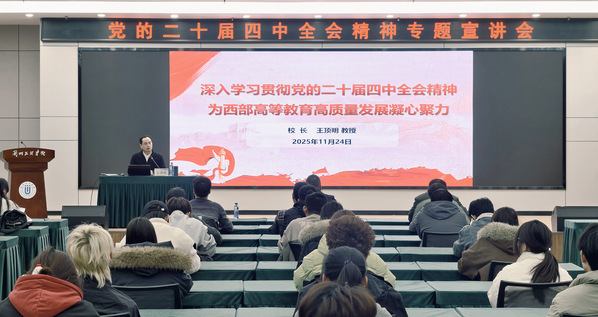 11月24日,校长王顶明在数字媒体学院(计算机学院)作专题宣讲,围绕“深入学习贯彻全会精神,为西部高等教育高质量发展凝心聚力”主题,系统阐释了全会的时代背景、核心要义与战略意义,重点解读了其中对西部高校发展的指导作用。强调学校发展要坚持“与党同心,与国同行,与时代同频共振”,以全会精神引领“三步走战略”实施,聚力完成“硕点建设”“创大申博”等重点任务,勉励师生坚定理想信念、勤学苦练本领、锤炼品德修养、开拓创新思维,为服务国家战略和西部发展贡献力量。